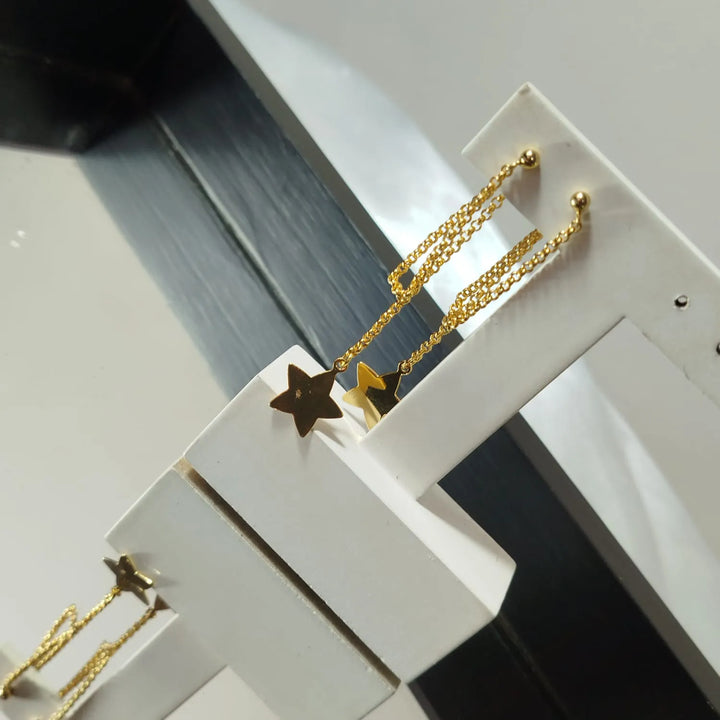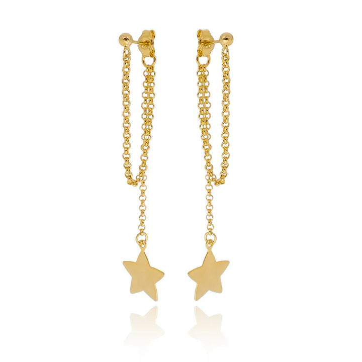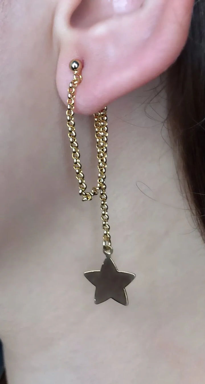 O brinco é composto por um brinco de bolinha dourada, uma corrente de elos e um pingente de estrela pendurado, fecho tipo tarraxa, folheado em ouro 18K. O brinco longo pingente de estrela folheado em ouro 18K é um brinco maravilhoso que fica lindo se combinado com brincos de segundo e terceiro furo como argolinhas com pingentes de estrela ou pontos de luz. Aproveite e veja mais da nossa coleção sky no site Amarylis semijoias.