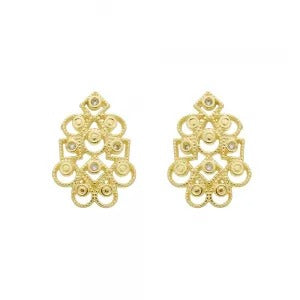 Brinco médio com zircônia sobrepondo formas geométricas folheado , com fecho tipo tarraxa.