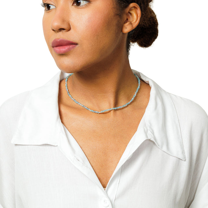 A choker é confeccionada em metal, disponível nas versões folheada em ouro ou banho de prata, medindo 35 cm de comprimento. Composta por pedras naturais de amazonita ao longo de toda a peça, seu design realça o tom esverdeado vibrante das pedras em contraste com o acabamento metálico. Moderna e delicada, é ideal para sobreposições ou uso individual, trazendo cor, elegância e autenticidade aos looks. Joia exclusiva Amarylis Semijoias, perfeita para quem busca originalidade, sofisticação e estilo tanto para o dia a dia quanto para ocasiões especiais.