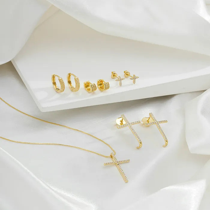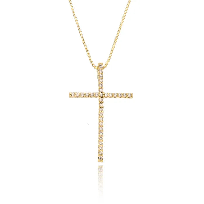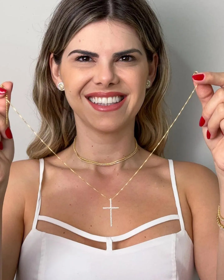 O colar possui um pingente de cruz com microzircônias cravejadas na cor transparente. A corrente possui 45,0 cm de comprimento e possui também um extensor de 10 cm. O pingente tem 2 cm de largura, 3 de comprimento e pesa 3,5 g.