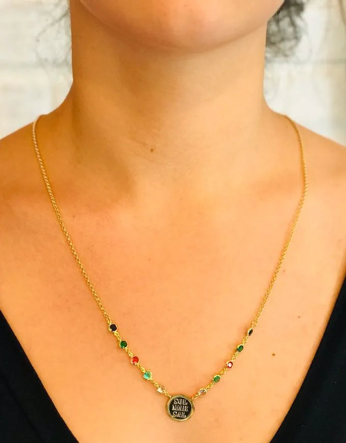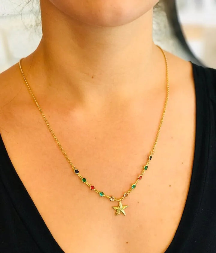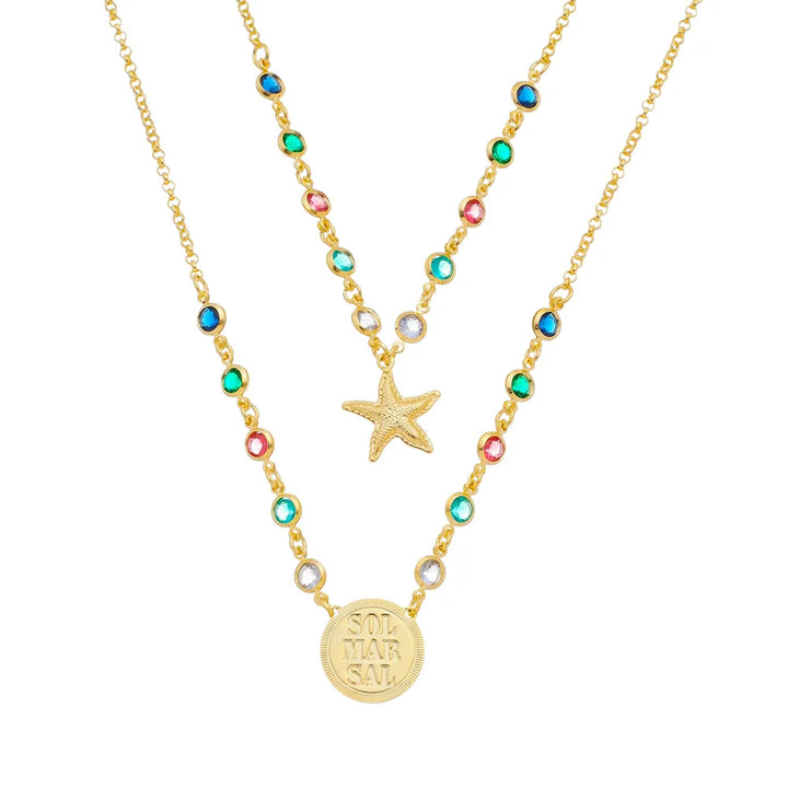 O colar escapulário é composto por um pingente de estrela do mar e um pingente com a frase sol, mar e sal com a parte de traz contendo uma onda, ele possui zircônias nas cores azul escuro, verde escuro, vermelho, verde claro e cinza, o seu banho é de ouro 18k que traz ainda mais beleza a peça. É um modelo lindo para o verão pois é uma peça viva e vibrante. Ele pode ser combinado com argolas lisas e pulseiras coloridas para deixar seu look ainda mais despojado e alegre. Encontre essa e outras peças no site da Amarylis semijoias.