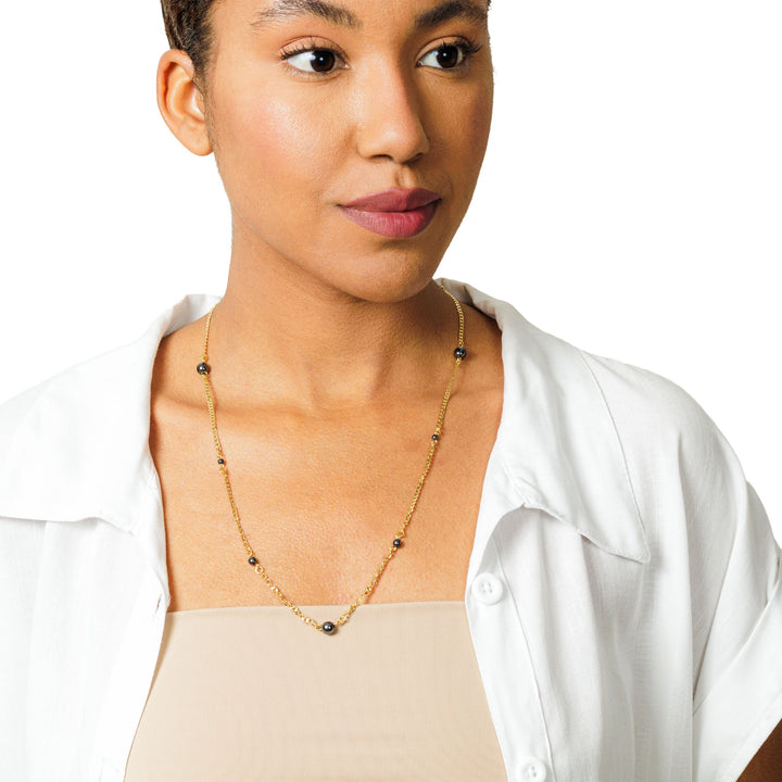 O colar é confeccionado em corrente grumet, disponível nas versões folheada em ouro ou banho de prata, com 60 cm de comprimento. Possui pedras naturais de hematita intercaladas ao longo da corrente em três tamanhos diferentes, proporcionando um efeito visual dinâmico, sofisticado e moderno. O tom grafite das hematitas contrasta com o brilho metálico, tornando o acessório versátil para combinações com outros colares ou para uso individual como peça de destaque. Joia exclusiva Amarylis Semijoias, ideal para quem busca estilo, autenticidade e originalidade em cada detalhe.