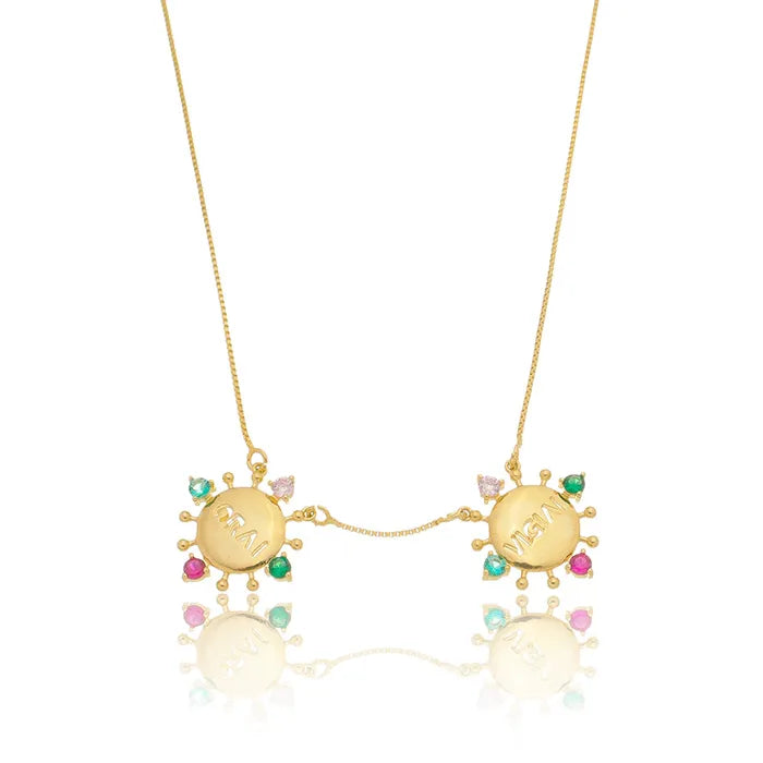 O colar possui corrente veneziana e duas medalhas escrito ORAI de um lado e VIGIAI do outro. As medalhas possuem quatro zircônias coloridas cravejadas e micro bolinhas em volta. Orai e Vigiai para que não entreis em em tentação.