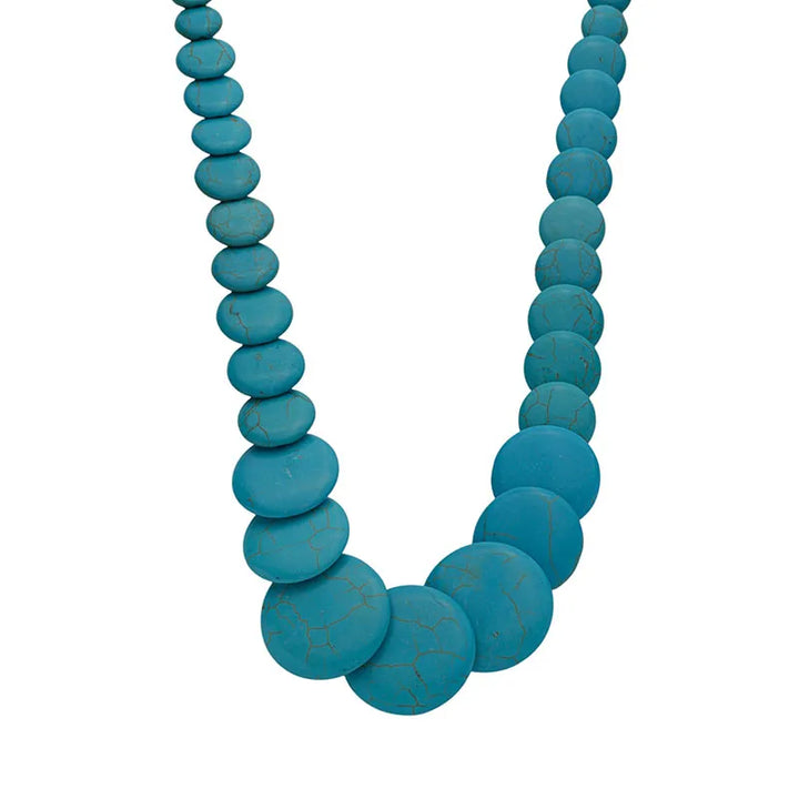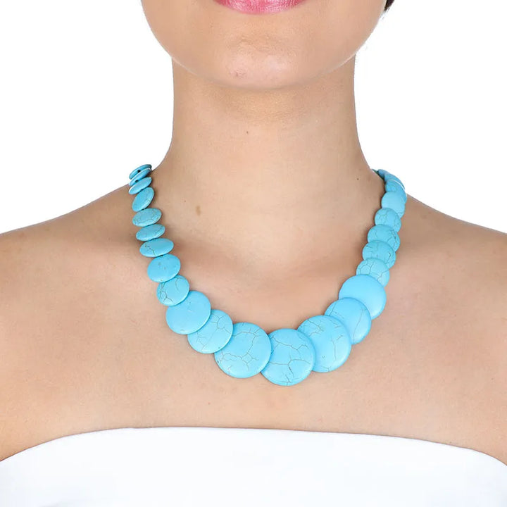 Colar azul-turquesa com pedras discóides que crescem de tamanho até o centro. Estilo boho chic, vibrante e marcante. Ideal para looks casuais, praianos ou com pegada étnica. Destaca-se com roupas neutras ou escuras. Cor viva, estilo único e toque natural chique.